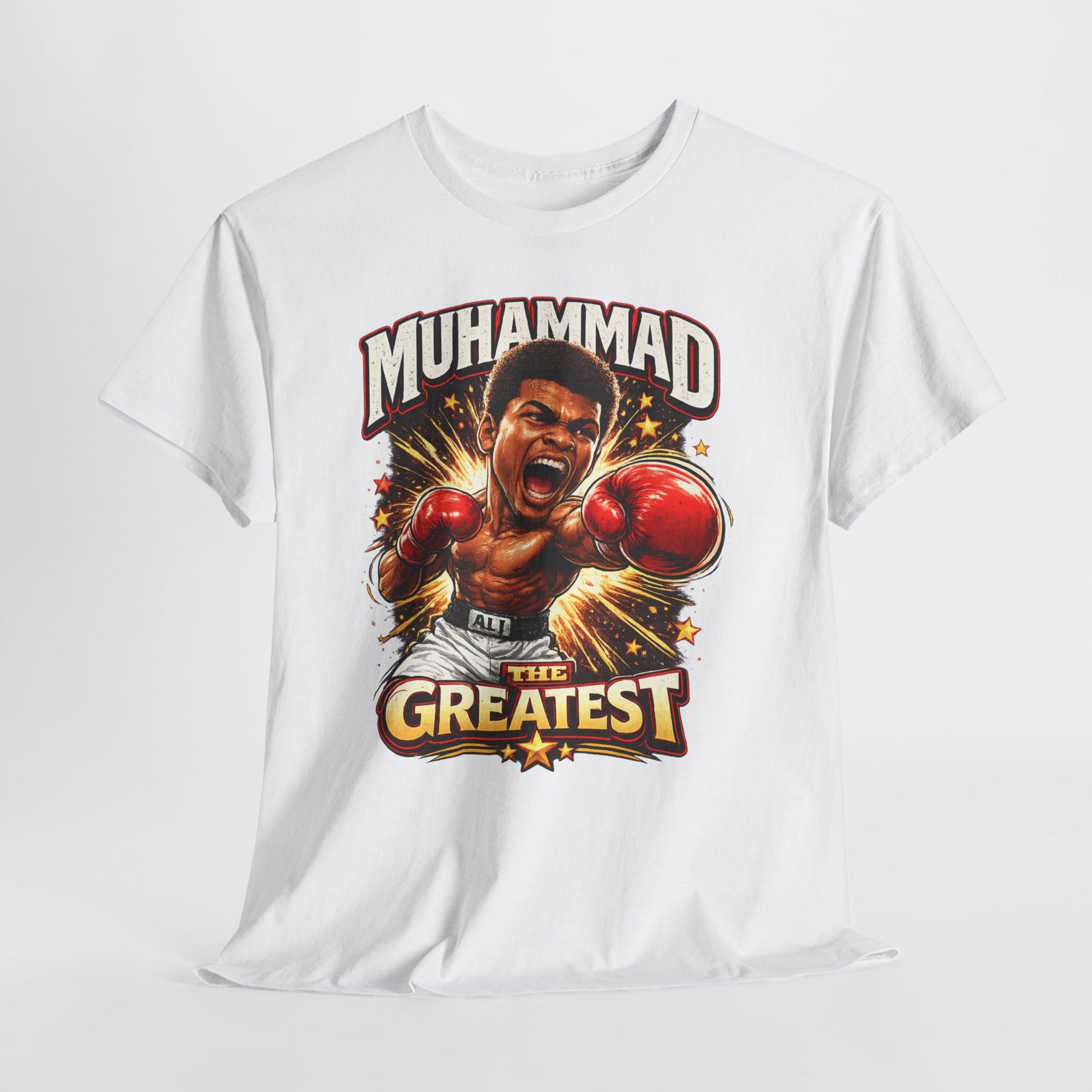 This white cotton tee puts bold boxing spirit front and center. A vivid, action-packed illustration captures a champion mid-punch, surrounded by dynamic highlights and the headline “Muhammad — The Greatest.” Wear it when you want your look to feel charged: the heavy-weight cotton drapes with a relaxed, classic silhouette while the bright print holds crisp detail and contrast on the clean white background. It reads like a tribute — energetic, confident, and unmistakably sporty — fitting into everyday wardrobes of people who root for legends, train in the gym, or collect fight-culture apparel.
