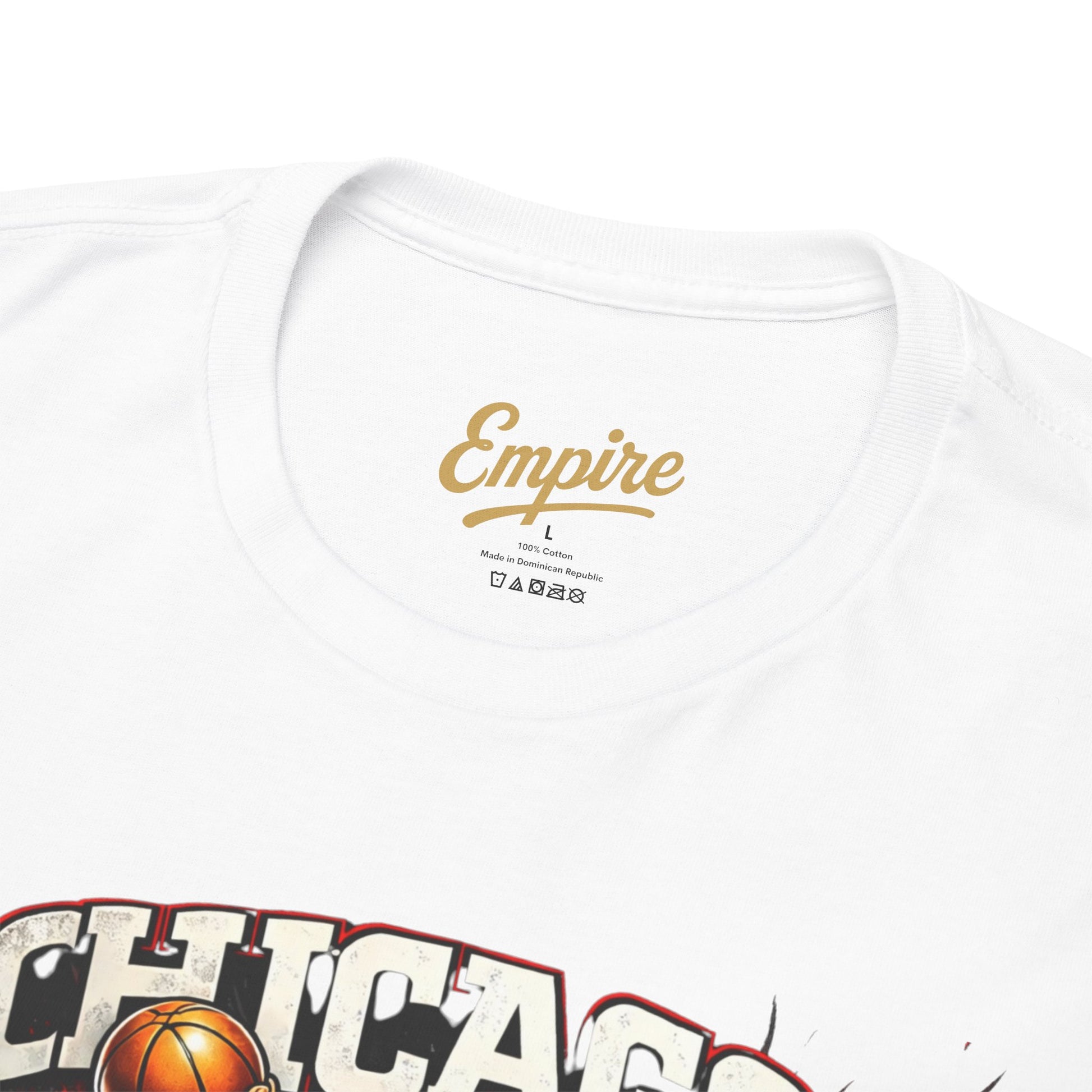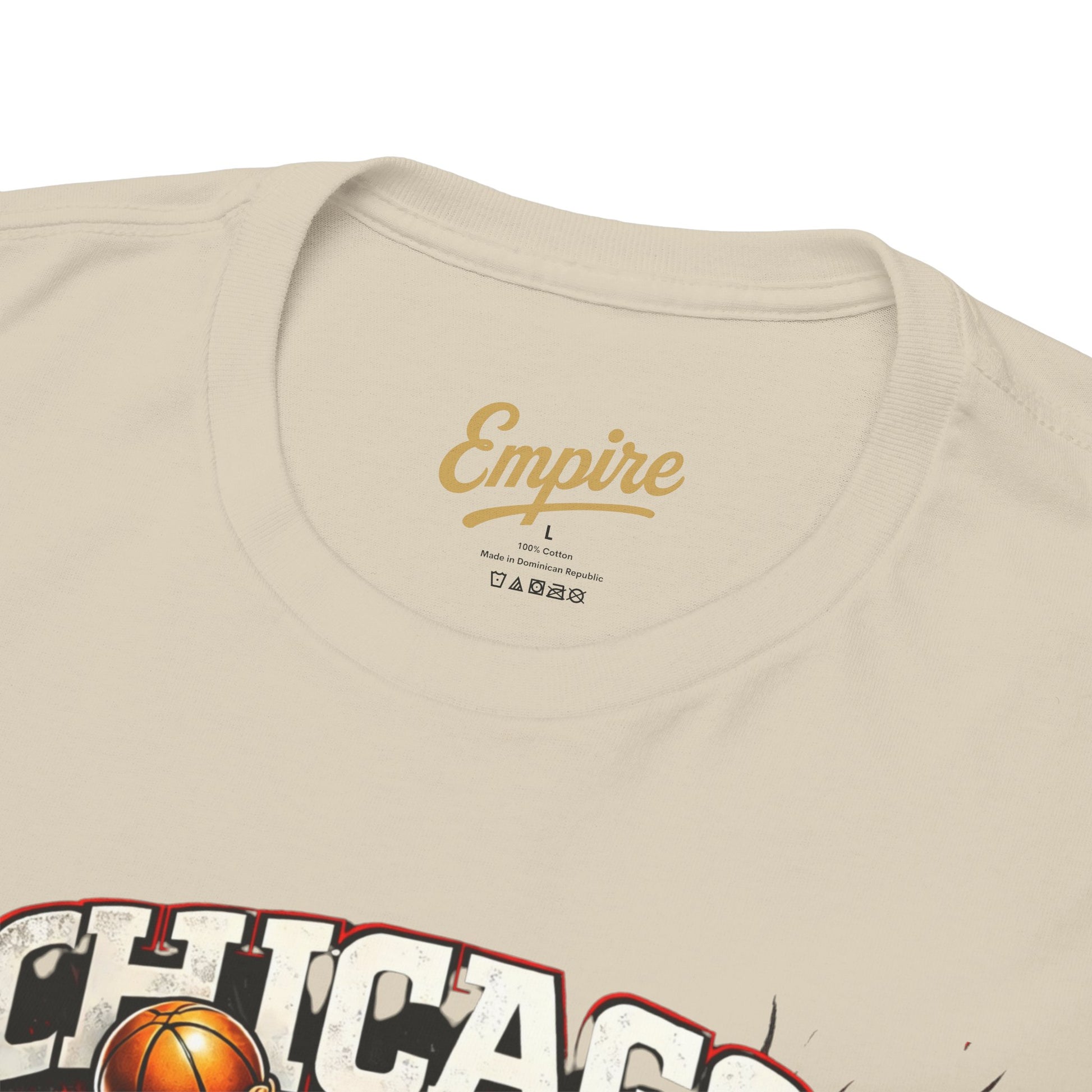 This relaxed-fit cotton tee brings a bold, vintage-street energy to everyday wear. The front art — a gritty, poster-style collage centered on 'Chicago' and rendered in warm reds and deep shadows — reads like a downtown mural or a game-day flyer. Wear it to root for hometown teams, wander city blocks, or layer under a jacket for nights out. The crew neck and classic fit keep the silhouette easy and familiar, while the vivid print becomes the outfit’s focal point. Soft, breathable cotton and a tear-away label make it comfortable all day; the robust print methods ensure the artwork stays sharp through washes. It feels lived-in from day one, like a memory you can wear.