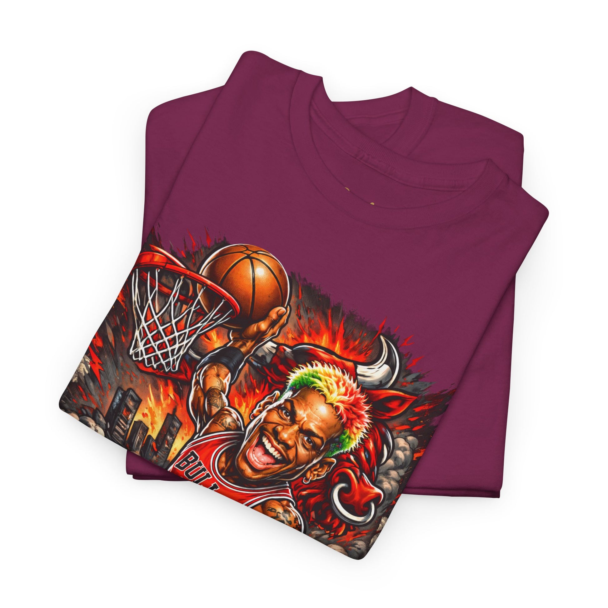 This tee channels raw, in-your-face basketball energy — a bold graphic of Rodman in full flight on the front, with his name and iconic #91 on the back. The artwork bursts with motion and grit: intense colors, textured shading, and court-side details that feel alive. Wear it to bring stadium attitude to the street, layered under a jacket or worn solo. The classic crew cut and relaxed fit let the print do the talking while staying comfortable all day. Built from durable, ethically sourced cotton and printed with crisp DTF/DTG techniques, this shirt feels substantial and keeps its look through washes. It’s for fans who want to show allegiance to the game and its characters with a striking, wearable piece of fan art.