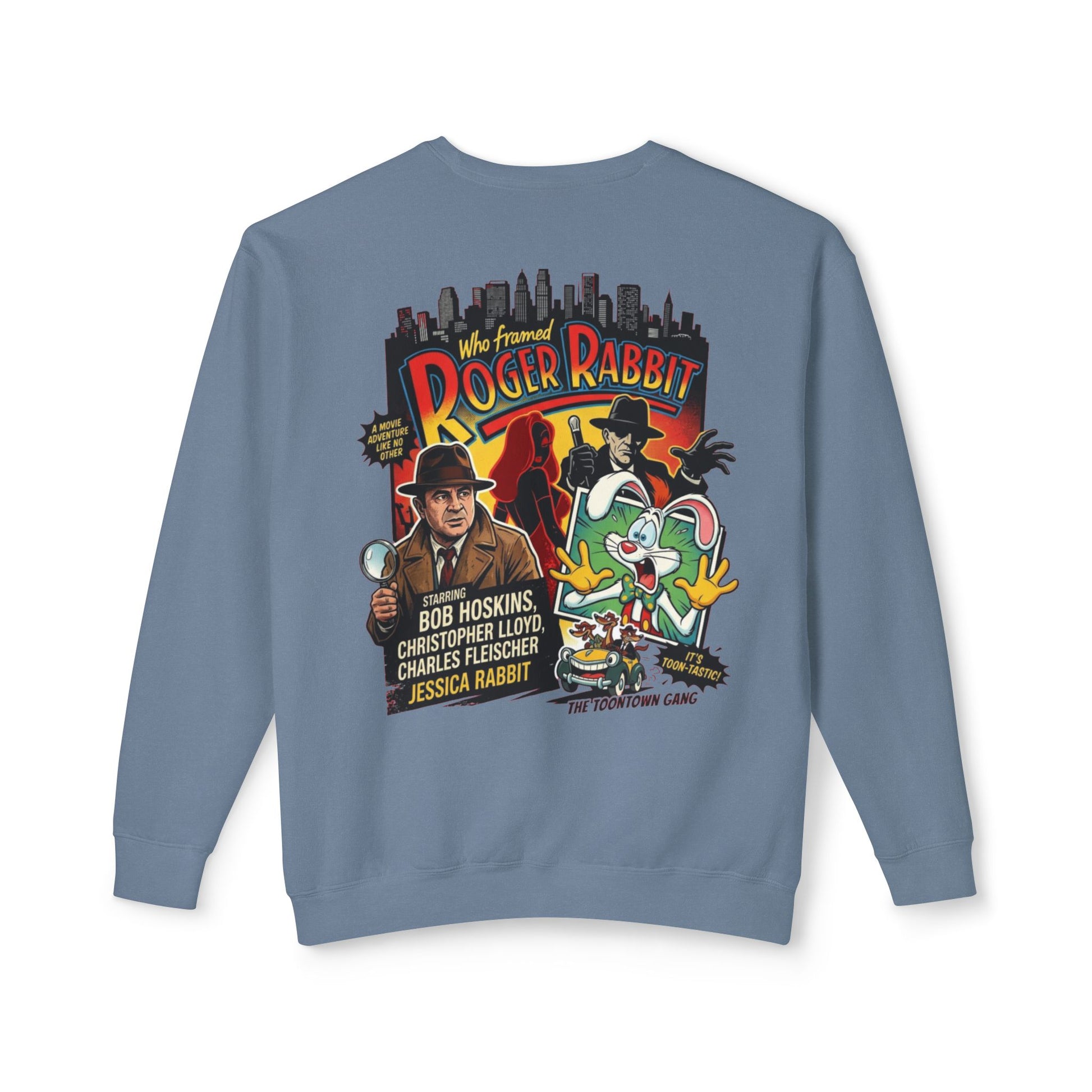 A lightweight crewneck that brings animated nostalgia into everyday wear. The soft, ring-spun cotton feels breathable and easy against the skin, while the retro Roger Rabbit-inspired artwork pops on the chest and across the back. Wear it on cool mornings when you want a laid-back, storybook vibe—whether you're wandering the city streets, meeting friends for coffee, or settling in for a movie night. The relaxed fit and flexible ribbed cuffs keep the silhouette casual and comfortable. This sweatshirt reads like a small celebration of classic animation, made to be worn by anyone who remembers the mischief and warmth of those characters.