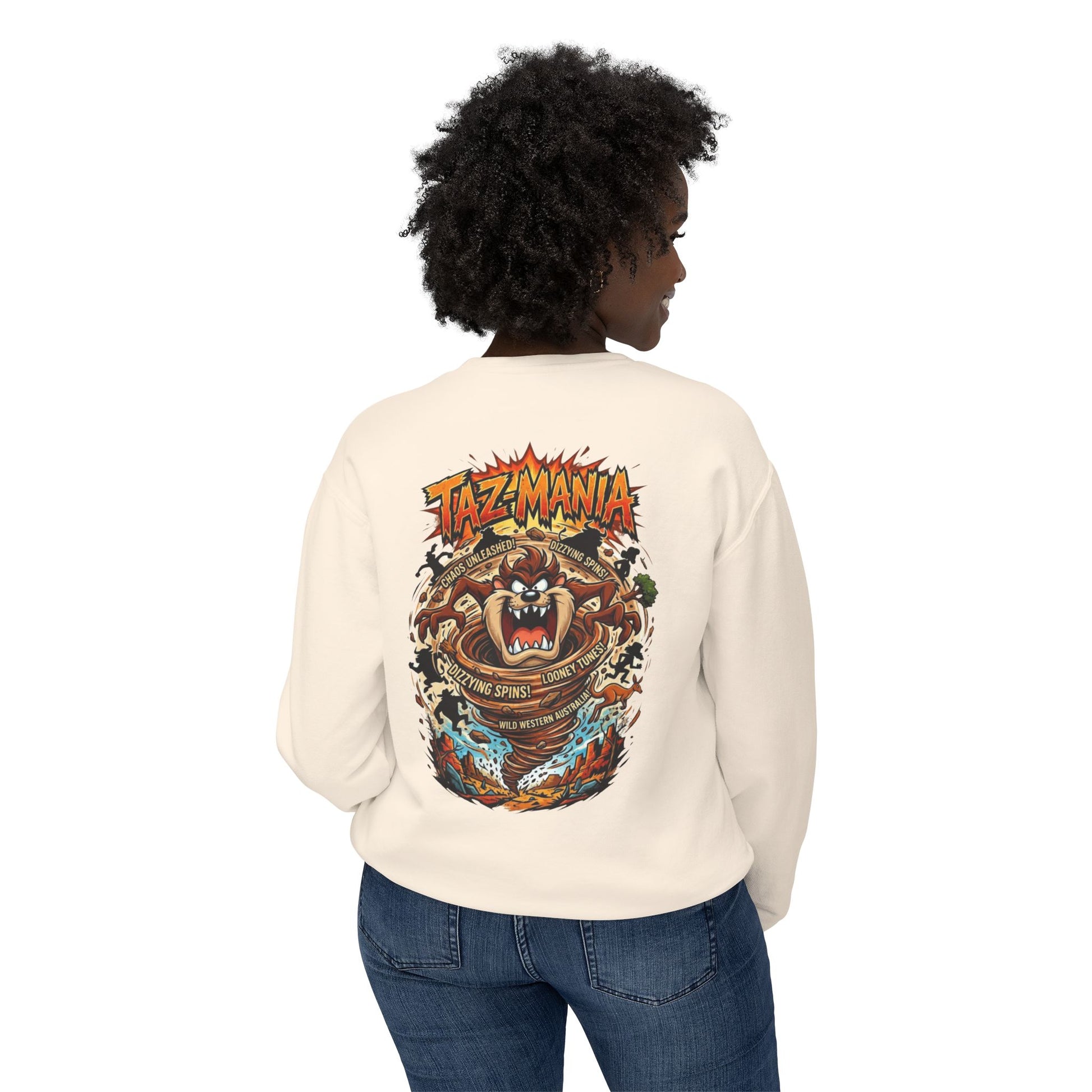 This lightweight crewneck brings vintage cartoon energy into everyday wear. The front shows a small chest emblem while the back erupts with a colorful, high-energy Taz graphic—whirling lines, roaring expression, and retro typography that read “Taz Mania.” It feels like a worn-in concert tee from an animated era: playful, loud, and full of motion. The soft, breathable cotton and relaxed cut make it easy to layer on cool mornings or wear solo when you want a statement without stiffness. Slip it on for skate sessions, late-night diner runs, or when you want to channel a nostalgic, mischievous vibe around friends.